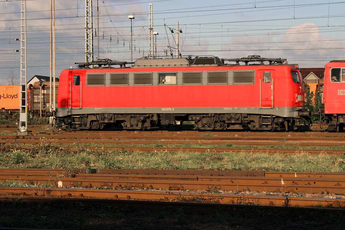 | Die tiefstehende Sonne bescheint am 14.11.2004 herrlich die verkehrsrote 140 679 der Railion Deutschland AG Berlin in ihrem Heimat-Bw. Mannheim. | |