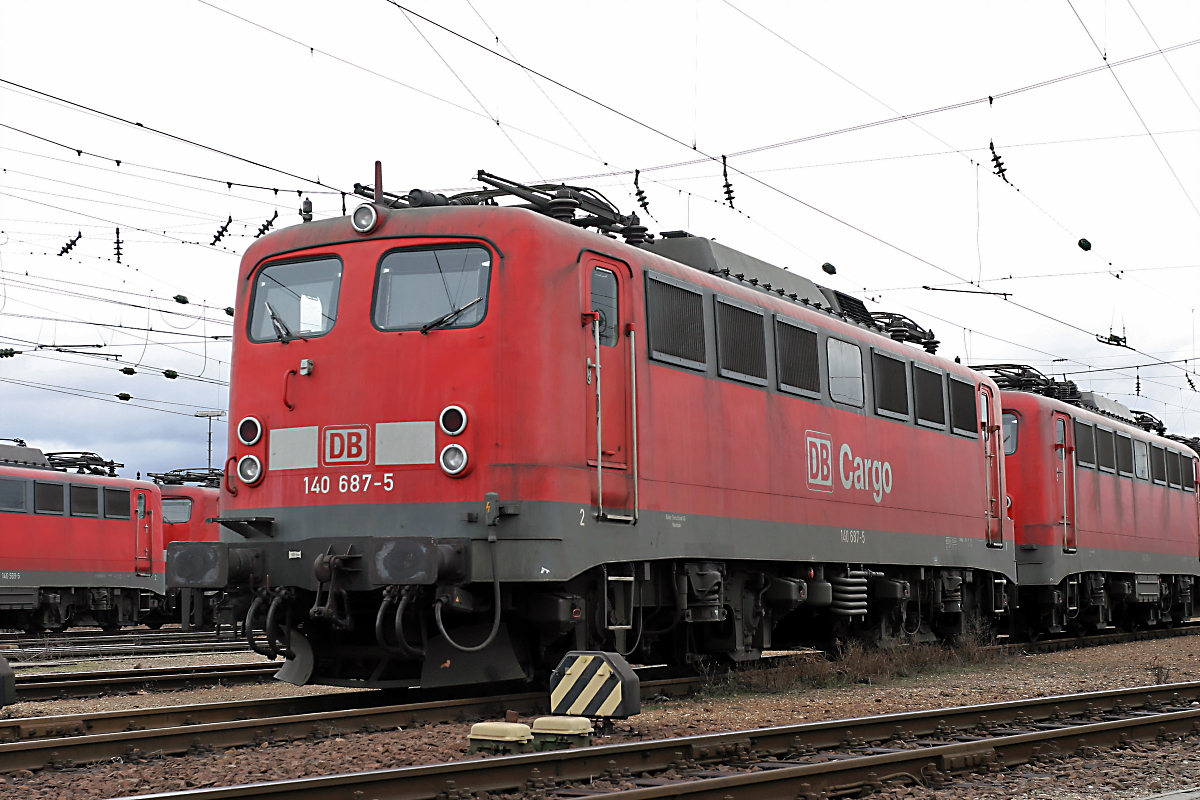 | Mit drei "Schwesterlokomotiven" steht 140 687 am 13.02.2005 am westlichen Abstellbereich des Rbf. Mannheim. | |