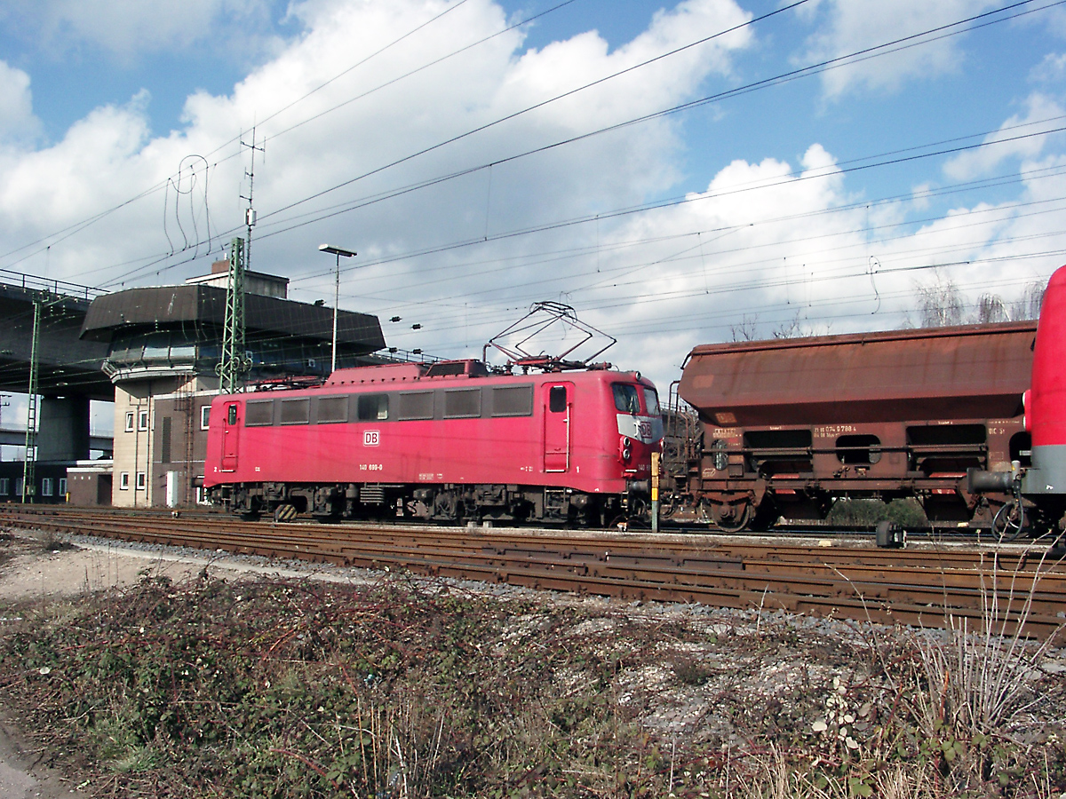 | Gerade hat die orientrote 140 699 dem Rbf. Mannheim verlassen und fährt nun am 14.03.2004 am Stellwerk vorbei weiter in Richtung Mannheim. | |