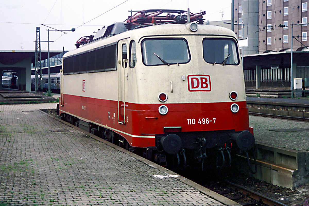 | Wenige Monate nach ihrem Rückbau steht 110 496 am 24.08.1995 an einem Stumpfgleis im Hbf. Heidelberg. | |