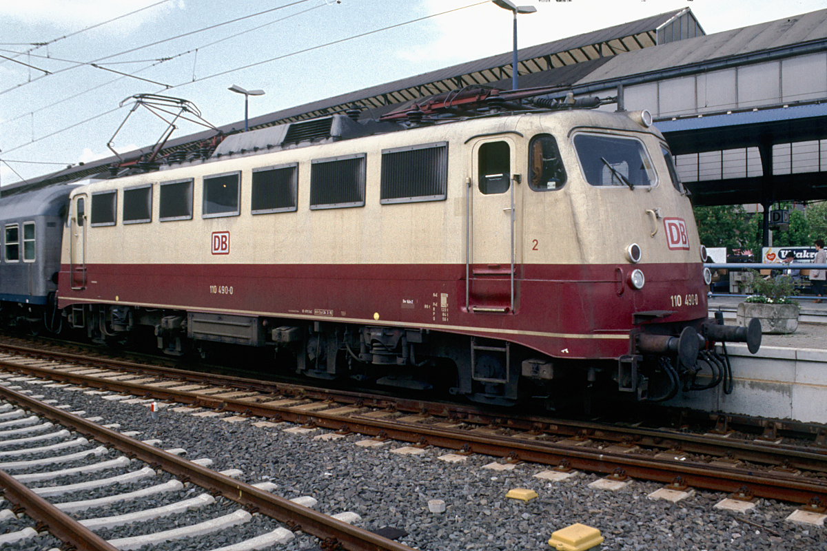 | Aller guten Dinge sind Drei: Nach den Bildern dieser Lok in rot/beige als 112 und 114 490 folgt hier als letzte Variante in dieser "edlen" Lackierung eine Aufnahme als 110 490, entstanden am 06.05.1994 im Hbf. Bonn, wobei der Aufnahmeort nicht ganz sicher ist Vielleicht kennt sich da jemand besser aus. | |