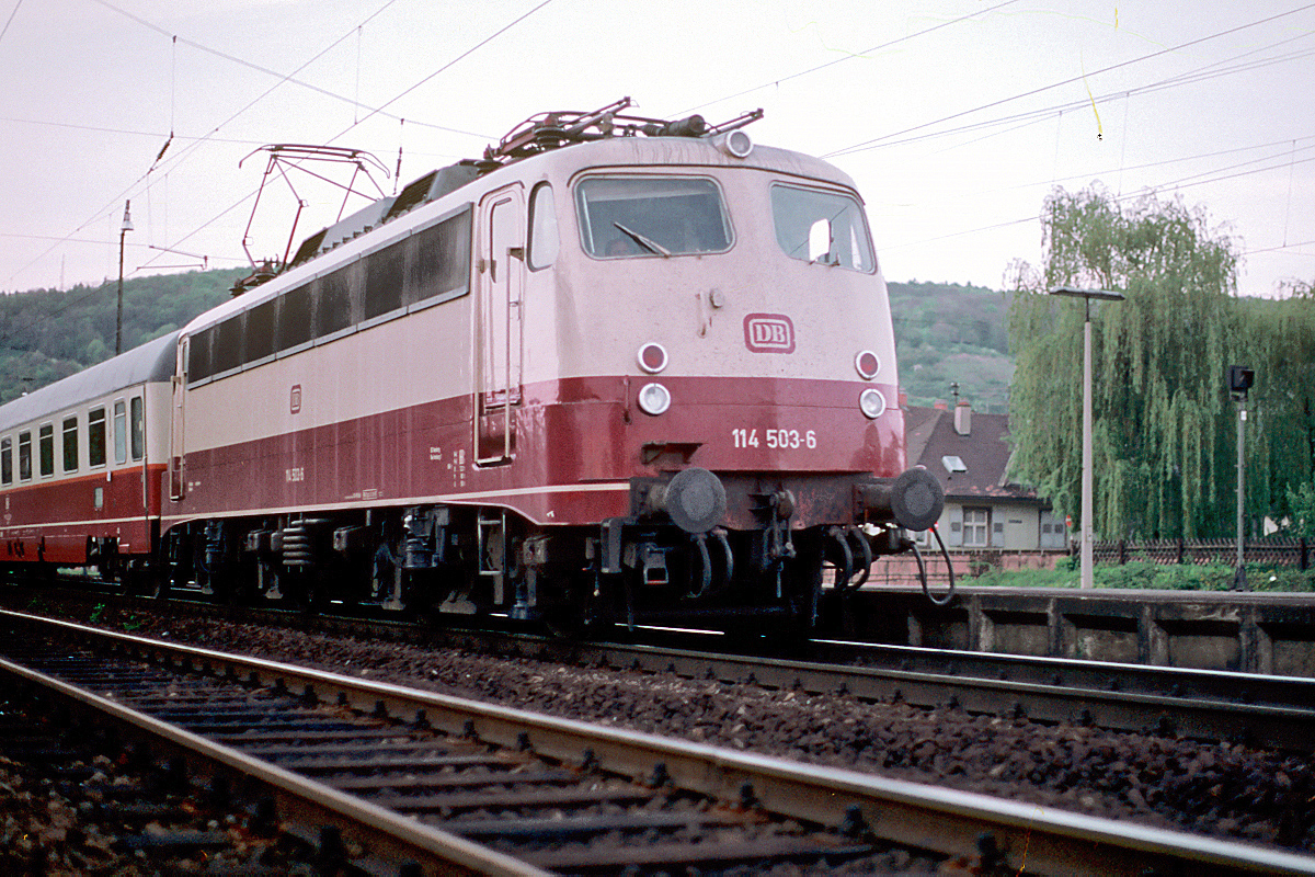 | 114 503 fährt mit seinen Rheingoldwagen am 09.04.1988 aus Darmstadt kommend in den Hbf. Weinheim ein. | |