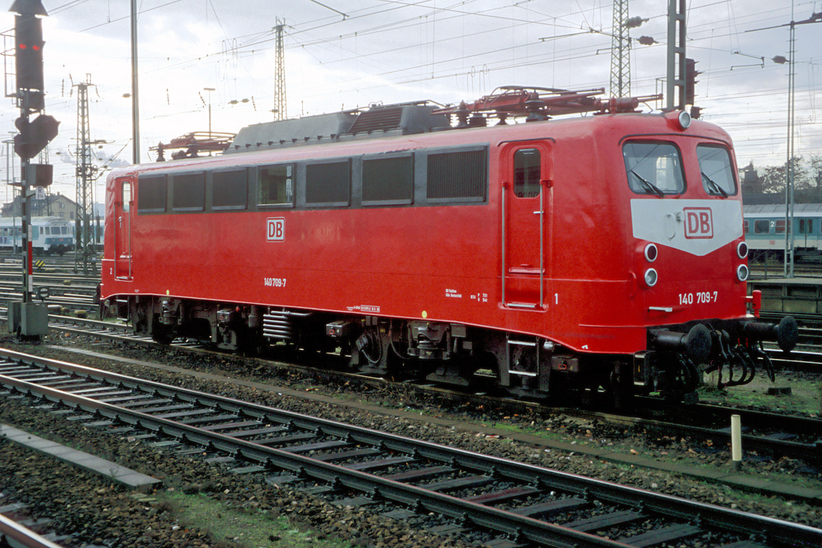 | Am 30.11.1996, nur zwei Monate nach ihrer orientroten Neulackierung, hält die in Köln-Deutzerfeld stationierte 140 709 am Prellbock zwischen den Gleisen 2 und 3 des Hbf. Mannheim. | |