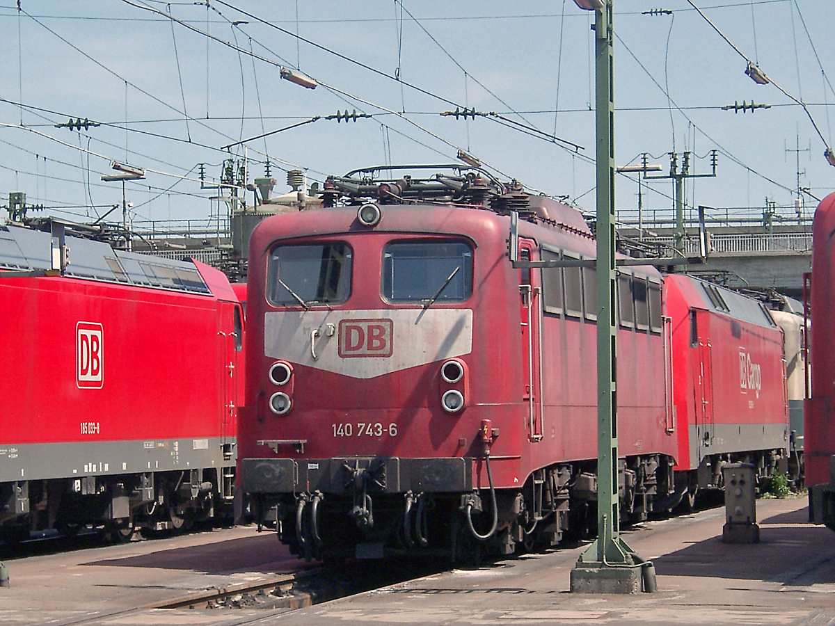 | Am 22.06.2003, ein Jahr vor ihrer z-Stellung, entstand die Aufnahme der unmittelbar an der östlichen Schiebebühne des Bw. Mannheim stehenden orientroten 140 743. | |