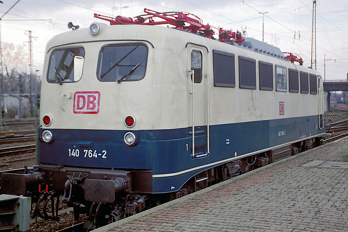 | Die bereits seit 1978 blau/beige lackierte 140 764 ist am Neujahrstag des Jahres 1998 an einem Prellbock im westlichen Teil des Hbf. Mannheim abgestellt. | |