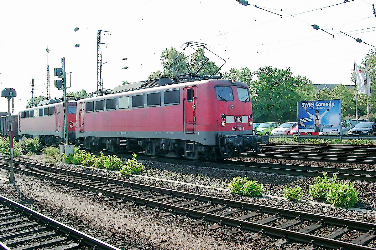 | Zwei Loks der BR 140 mit der 140 799 befördern am 25.08.2009 einen Güterzug durch den Mannheimer Hbf. in Richtung Ludwigshafen. | |