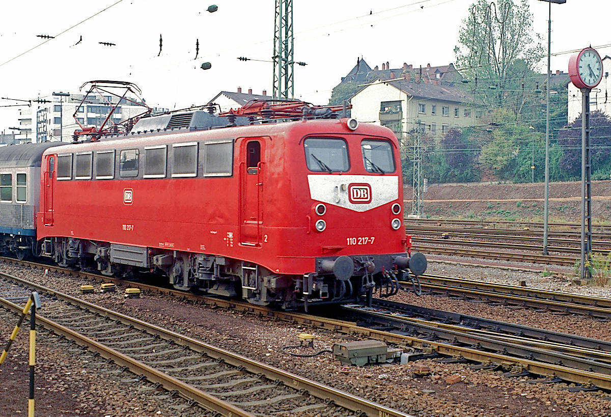 | Noch einwandfrei orientrot lackiert fährt 110 217 mit einem Nahverkehrszug am 26.08.1990, von Mannheim kommend, in den Hbf. Heidelberg ein. | |
