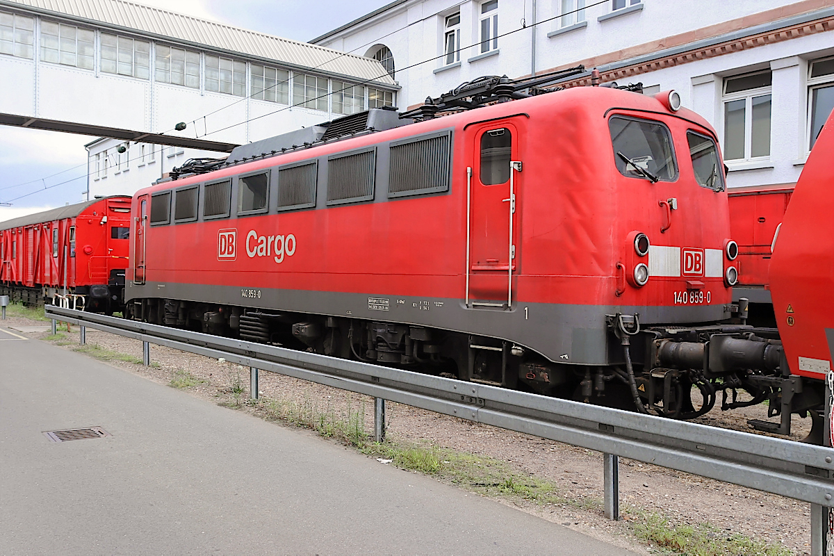 | 140 859 steht am 07.08.2005 auf einem Durchfahrtsgleis auf der südlichen Seite der Fahrzeughalle des Bw. Mannheim. | |