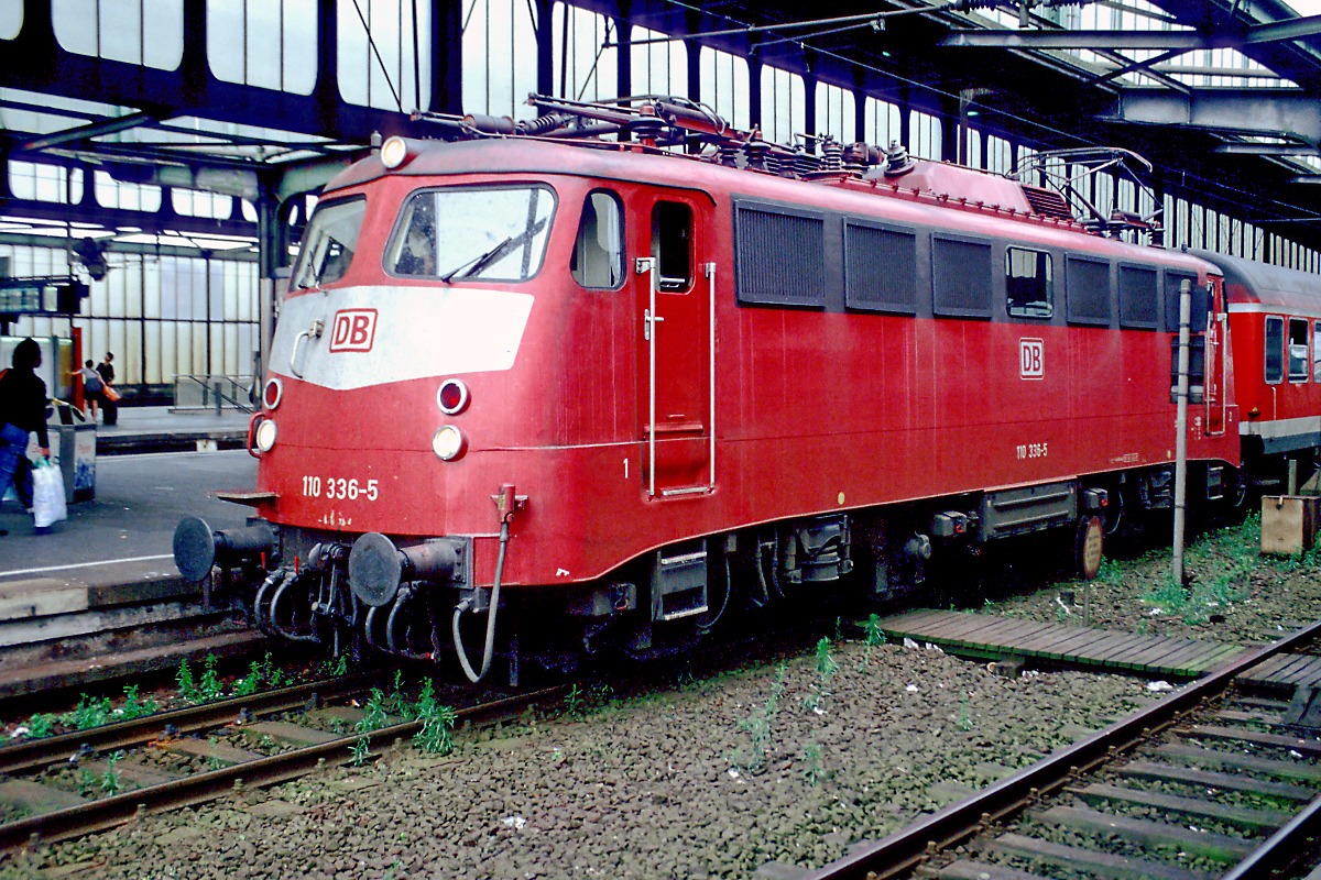 | 110 336 in orientroter Lackierung hält am 03.06.2000 mit einem Nahverkehrszug im Hbf. Duisburg. | |