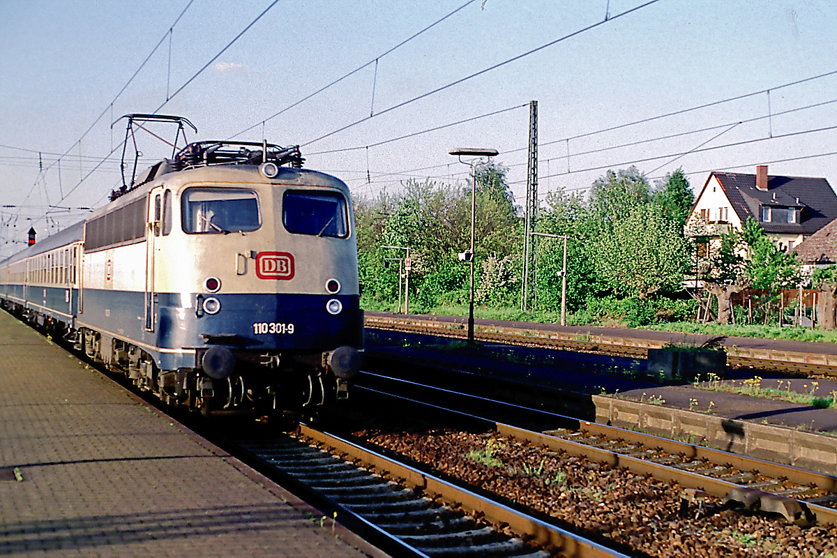 | Ein Jahr nach der Aufnahme der 110 301 im Hbf. Heidelberg ist die Lok zwar immer noch blau/beige, trägt aber inzwischen ein rotes DB-Logo, aufgenommen am 01.05.1994 bei der Durchfahrt mit einem D-Zug durch den Bf. Mannheim-Friedrichsfeld. | |