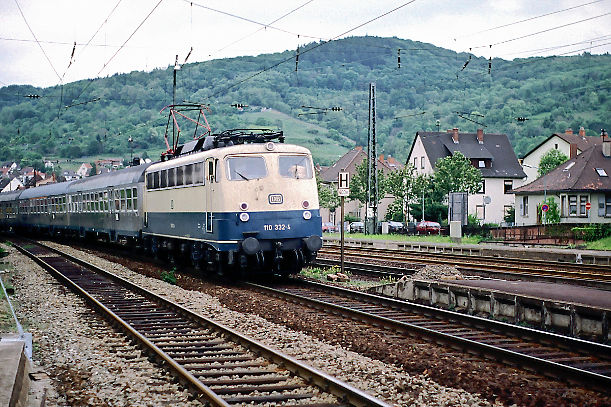 | Weri früher vom letzten Bahnsteig des Hbf. Weinheim in nördlicher Richtung fotografieren wollte, musste schnell sein, denn ein herannahender Zug kam hinter einer Kurve erst in letzter Sekunde "vor die Linse", wie hier am 26.05.1991 die blau/beige 110 332 mit ihrem D-Zug aus Darmstadt. | |