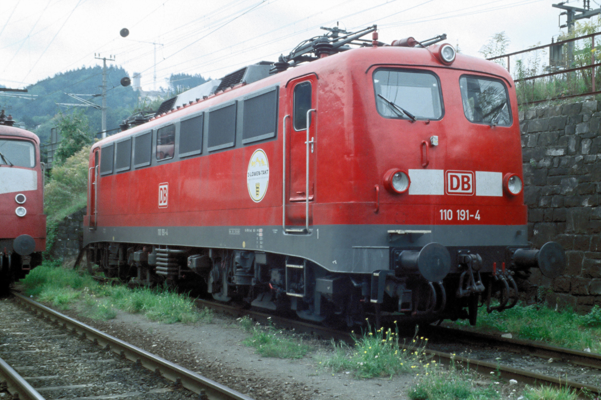 | Am 22.09.2001 hat es die 110 191 mit dem "alten" Aufkleber für den 3-Löwen-Takt in das österreichische Bundesland Tirol verschlagen. Dort konnte ich die Lok im "hintersten Winkel" der Zfl. Innsbruck neben einer orientroten Bügelfalten-110er fotografieren. | |