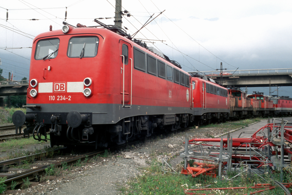 | "Fünfe auf einen Streich": 110 234 vor einer weiteren 110er, zwei Loks der ÖBB-BR 1063 und einer ÖBB 1044 am 22.09.2001 in der Zfl. Innsbruck. | |