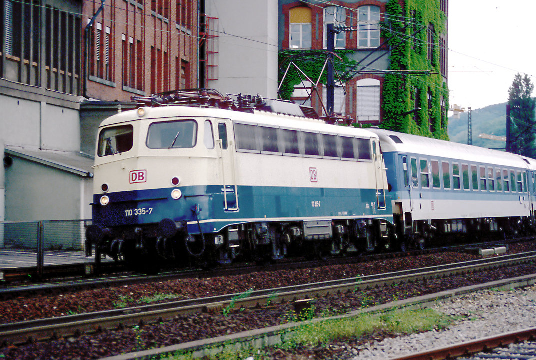 mit Interregio am 05.06.1995, aus Richtung Darmstadt kommend, kurz vor der Einfahrt in den Hbf. Weinheim.