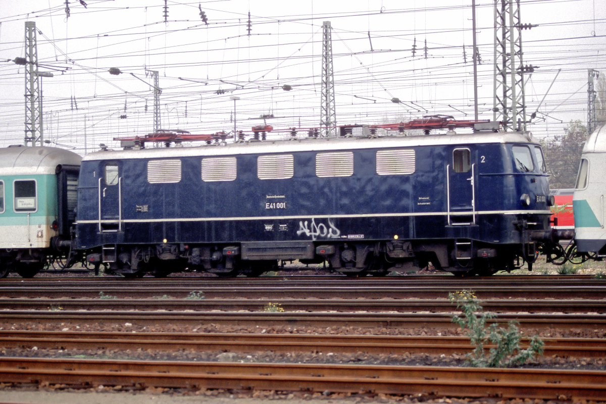 | Rund ein Jahr nach ihrer musealen blauen "Rücklackierung" konnte ich die spätere Museumslok 141 001 am 08.11.1998 im östlichen Vorfeld des Hbf. Mannheim fotografieren. | |
