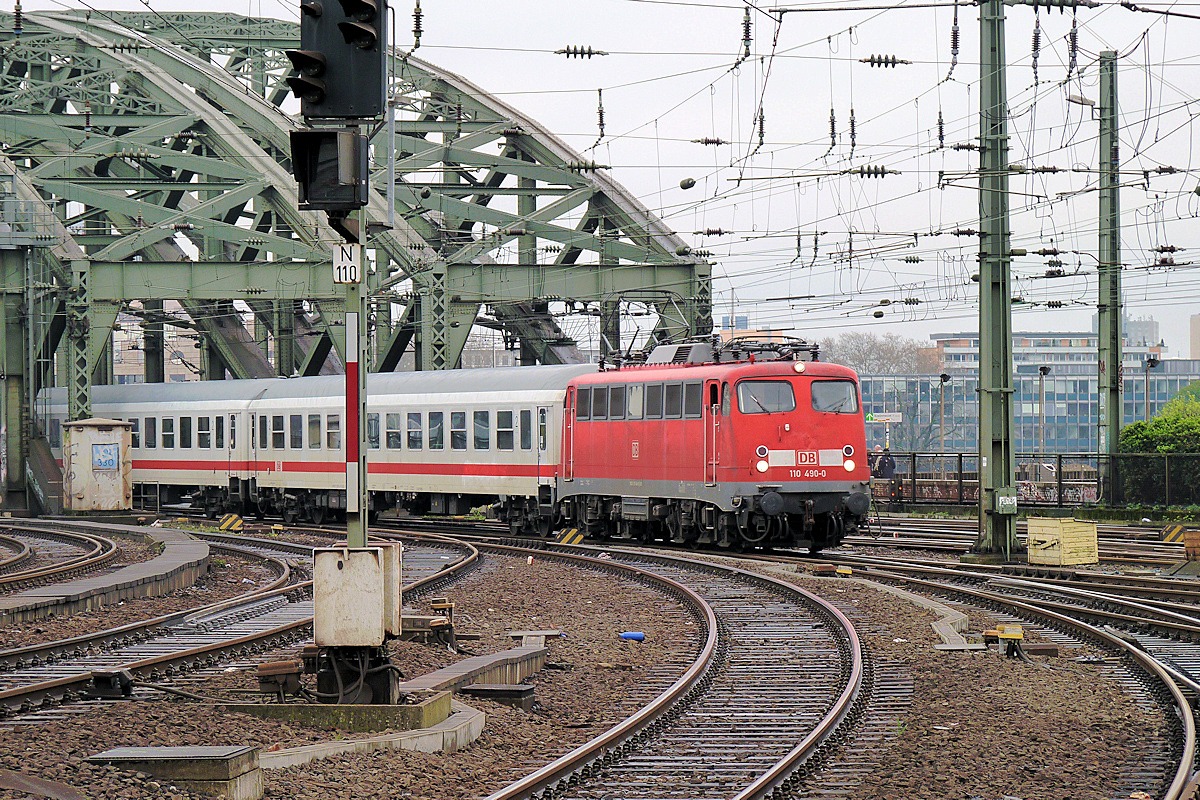 | Nach dem Überqueren der Hohenzollernbrücke nähert sich 110 490 am 03.04.2011 mit einem IC dem Hbf. Köln. | |