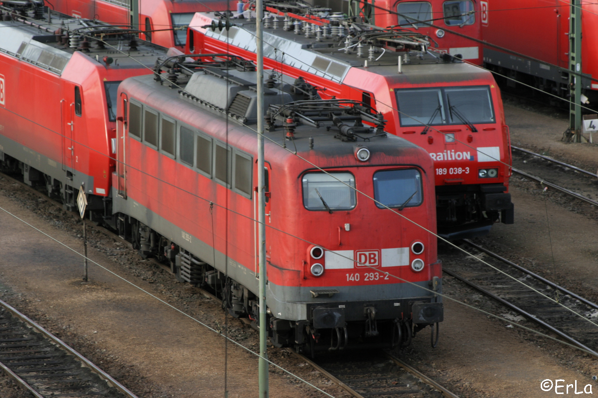 | Einen Blick von oben auf die 140293 gewährte am 06.01.2005 der Fußgängersteg auf das östliche Abstellgelände des Bw. Mannheim. | |