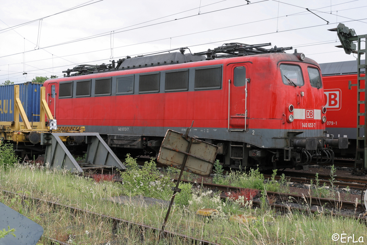 | Auf der westlichen Seite des Bahnhofs Mannheim-Friedrichsfeld, wo früher regelmäßig Zuckerrüben verladen wurden, ist 140 653 am 27.05.2007 mit einem Containerzug über's Wochenende abgestellt. | |