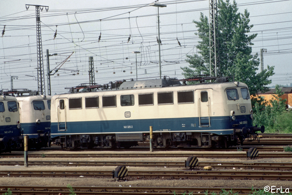 | 140 325 in blau/beiger Lackierung am 12.06.1988 auf dem westlichen Abstellbereich des Bw. Mannheim. | |