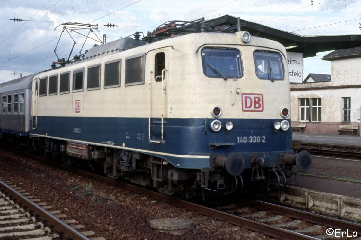 | Der wohl meist frequentierte Mannheimer Vorortbahnhof ist Friedrichsfeld, wo sich - aus Darmstadt kommend - die Linien nach Osten in Richtung Heidelberg, nach Süden (nur Güterzüge) gen Schwetzingen und nach Westen in Richtung Rbf. Mannheim und Ludwigshafen teilen. Hier haben sogar schon ICE gehalten, wenn auch nur "notgedrungen". Am 01.09.1993 war dieser interessante Bahnhof aus der Länderbahnzeit Station der blau/beigen 140 330. | |
