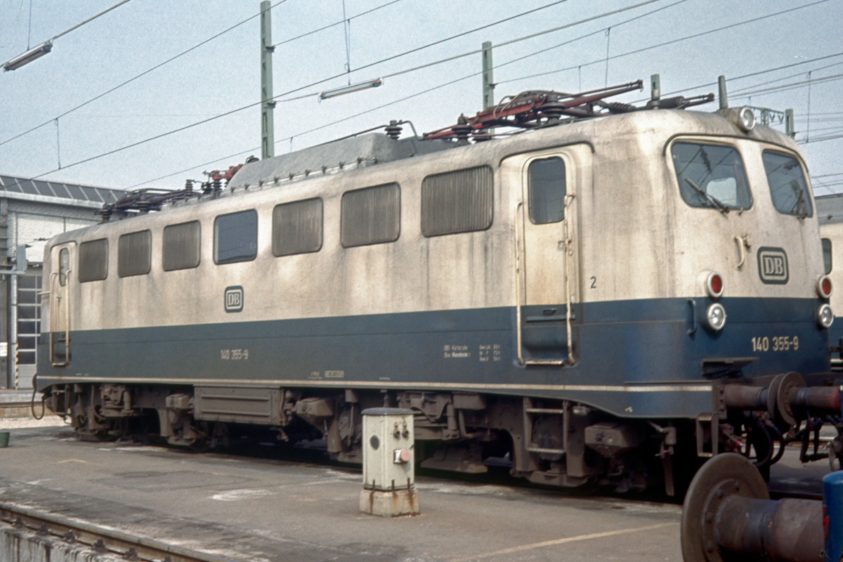 Unmittelbar an der Schiebebühne östlich der Fahrzeughalle des Bw. Mannheim steht am 01.04.1991 die blau/beige 140 355.