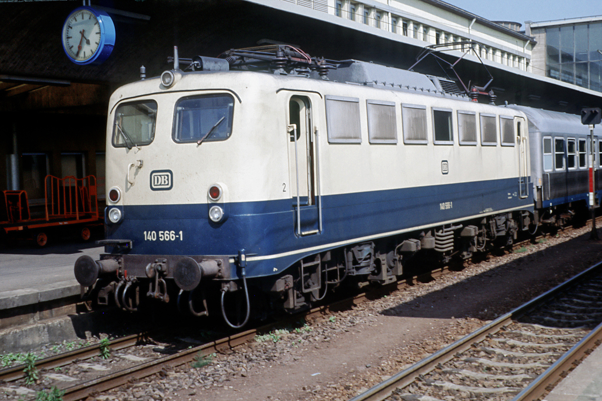 | Während ich auf meinen Zug nach Mannheim warte, steht am 03.07.1991 auf Gleis 1 die blau/beige 140 566 zur Abfahrt nach Weinheim und weiter nach Darmstadt bereit. | |
