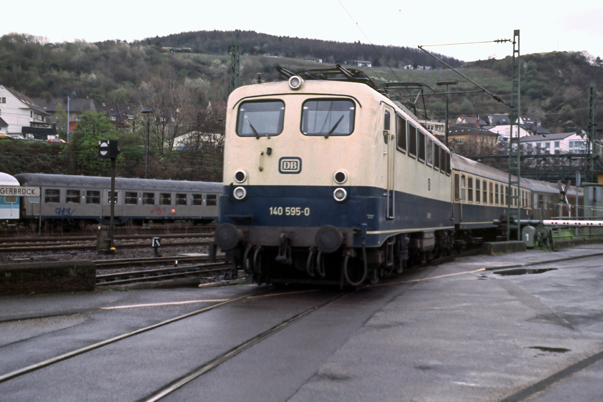 | Am 11.04.1993 - dem Aufnahmezeitpunkt - gab es noch den Bf. Bingsbrück, in den gerade die blau/beige 140 595 mit einem Nahverkehrszug einfuhr. | |