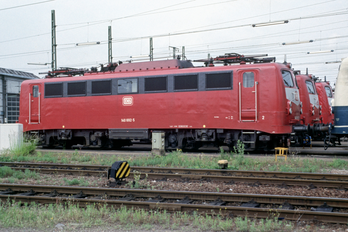 | Nach meinen Aufnahmen der 140 692 in grün und verkehrsrot fehlte bisher noch die orientrote Variante, hier aufgenommen am 26.02.2000 in ihrem Heimat-Bw. Mannheim. | |