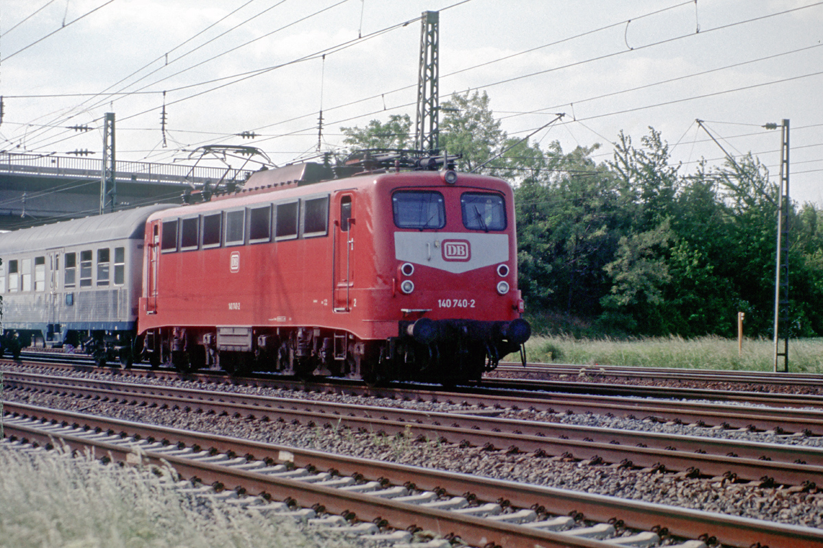 | 140 740 - orientrot und mit altem DB-Logo - fährt am 28.05.1992 mit einem Nahverkehrszug in den Bf. Mannheim-Friedrichsfeld ein. | |