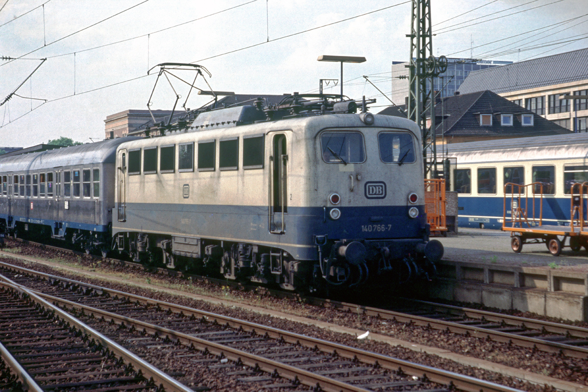 in blau/beiger Lackierung mit Nahverkehrszug am 24.05.1992 im Hbf. Mannheim.