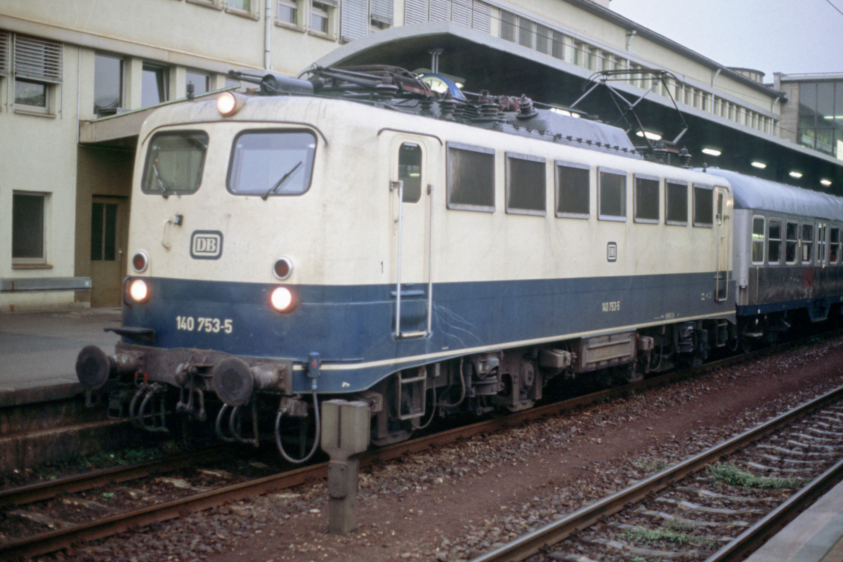 | Und wieder ist das inzwischen von zahlreichen anderen Aufnahmen bekannte Gleis 1 im Hbf. Heidelberg, auf dem sich am 23.10.1991 die blau/beige 140 753 dem Fotografen darbietet. | |