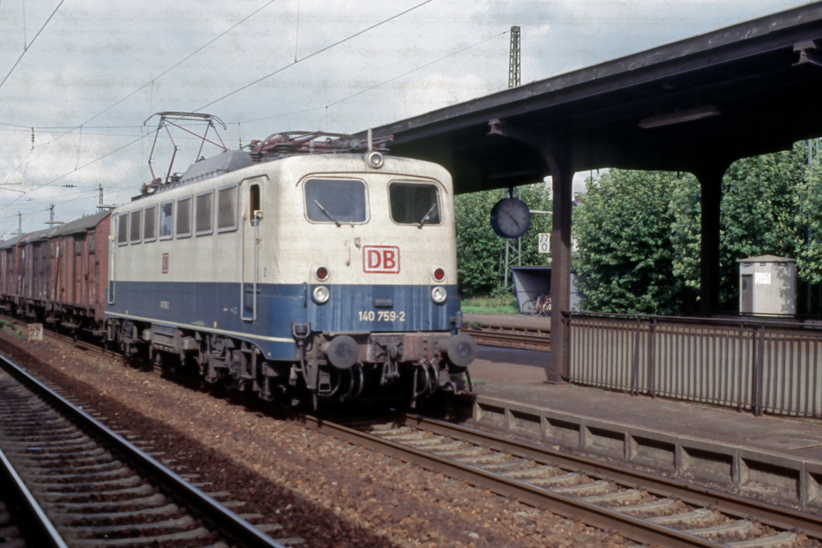 | Noch in ihrer Zeit, als sie im Bw. Frankfurt 1 beheimatet war, durchfährt am 01.09.1994 die blau/beige 140 759 den Mannheimer Vorortbahnhof Friedrichsfeld aus Richtung Darmstadt und weiter zum Rbf. Mannheim. | |