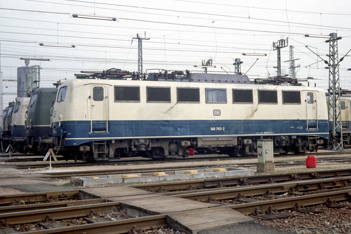 | "In Fünfer-Reihen angetreten!" die grüne 140 783 am 17.03.1991 als erste Lok neben vier weiteren Schwesterloks im Bw. Mannheim. | |