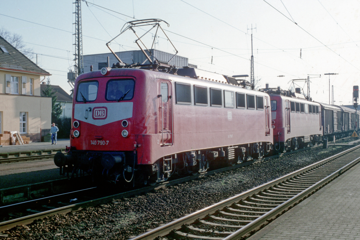 | Gleich zwei orientrote 140er mit 140 790 als Zuglok ziehen am 19.02.1994 einen Güterzug durch den Bf. Mannheim-Friedrichsfeld weiter in Richtung Weinheim und Darmstadt. | |
