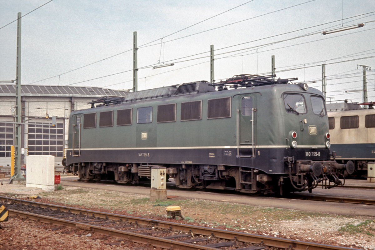 | Auf dem östlichen Abstellgelände vor der großen Fahrzeughalle des Bw. Mannheim steht am 01.04.1991 die grüne 140 799. | |