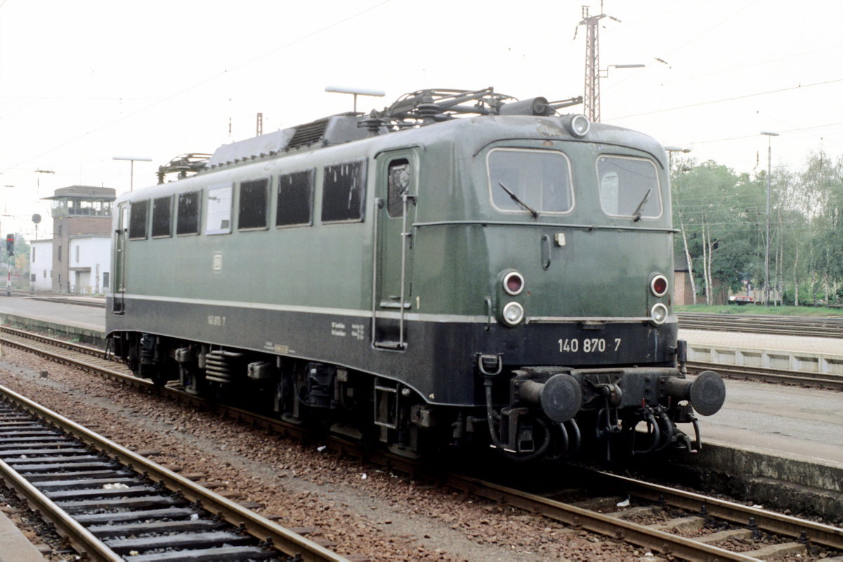 | Abgebügelt steht am 03.10.1990 - unweit ihres Heimat-Bw. Saarbrücken - die grüne 140 870 in Dillingen/Saar. | |