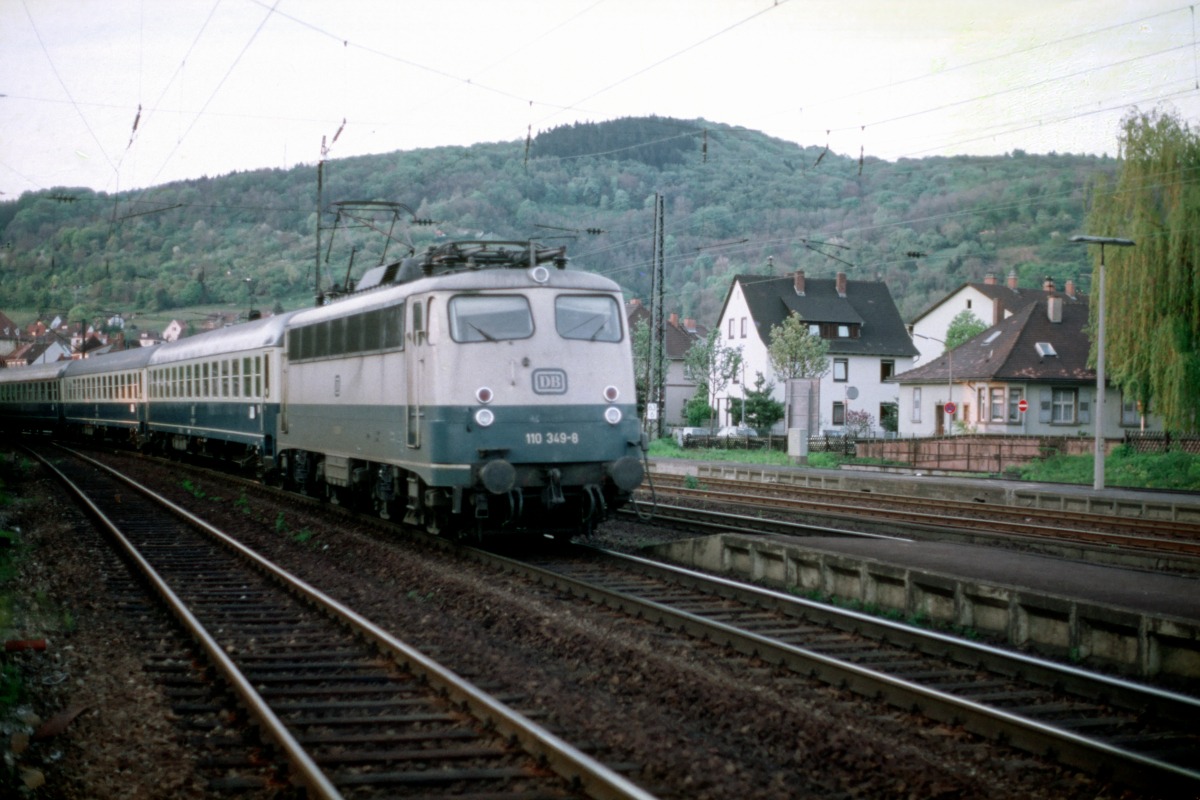 | Mit D-Zug-Wagen am Haken nähert sich die blau/beige 110 349 am 03.08.1988 aus Richtung Darmstadt dem Hbf. Weinheim/Bergstraße. | |