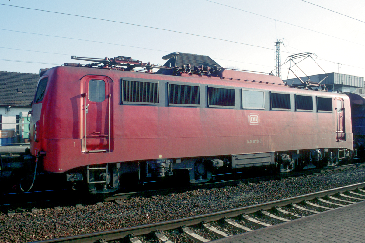| Nach der grünen und verkehrsroten Lackierung der 140 870 fehlt jetzt noch die orientrote Variante (blau/beige war die Lok nie), aufgenommen am 19.02.1994 auf der Durchfahrt durch den Bf. Mannheim-Friedrichsfeld in Richtung Darmstadt. | |