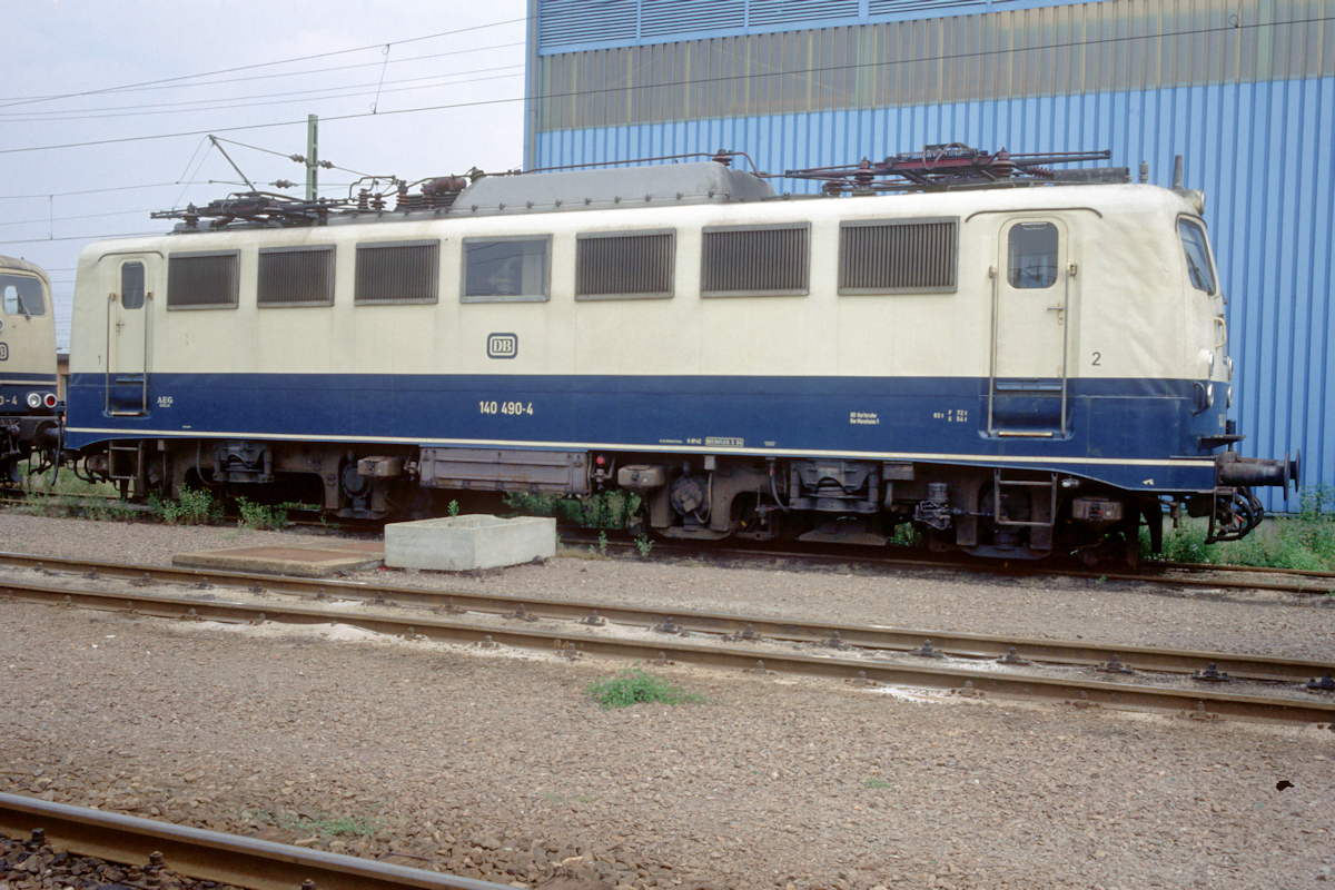 | Nach all den Aufnahmen der 140 490 in verkehrsrot war auch die blau/beige Variante fällig, hier aufgenommen am 19.07.1990 im westlicben Teil des Bw. Mannheim. | |