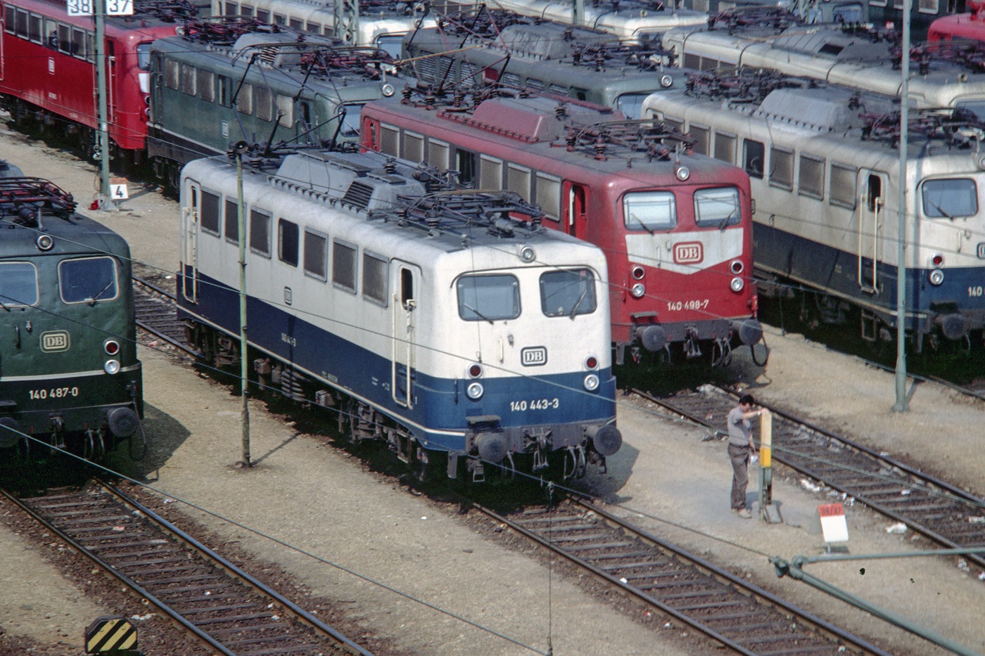 Vier Loks der BR 140 in drei Farben, darunter die blau/beige in Seelze stationierte blau/beige 140 443 am 14.04.1991 im Bw. Mannheim.