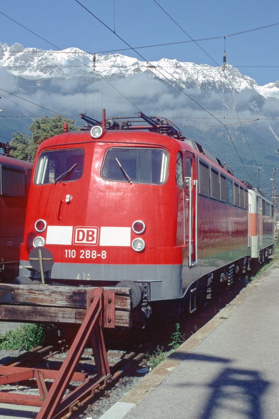 | Mit der mächtigen Kulisse der Nordkette im Hintergrund steht am 23.09.2000 in der Zfl. Innsbruck die 110 288 vor der 111 173 im S-Bahn-Look. | |