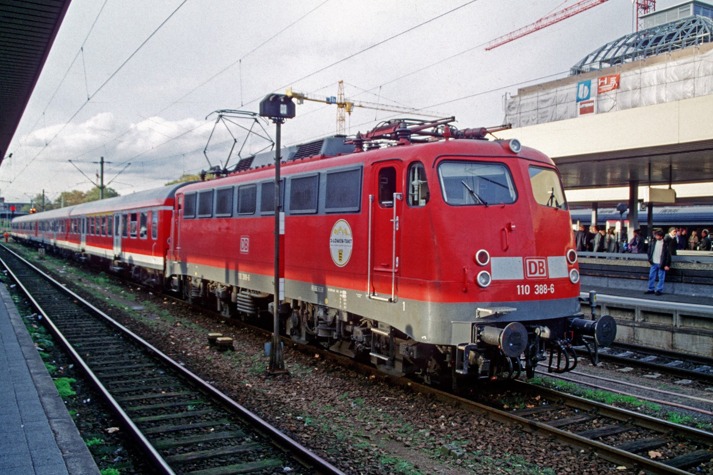 | Ein Nahverkehrszug in verkehrsrot mit der gleichfarbigen 110 388 hält am 03.09.1994 auf dem Durchfahrtsgleis 6 im Hbf. Mannheim. Die Lok trägt noch den ursprünglichen großen Aufkleber für den 3-Löwen-Takt. | |