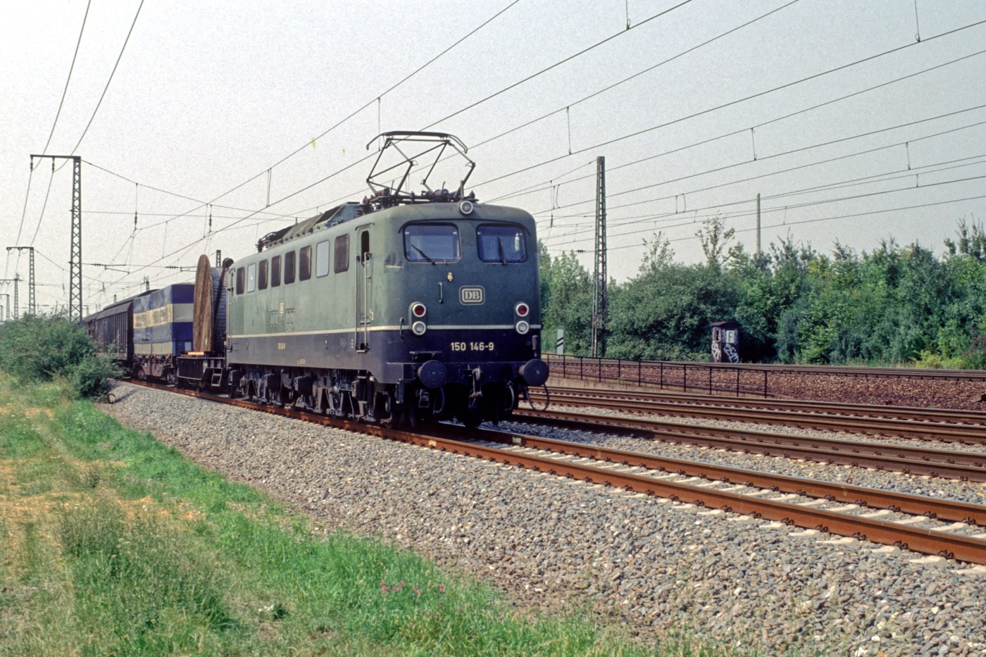 | Auf der alten Güterzugstrecke zwischen Mannheim und Heidelberg ist 150 146 am 22.07.1990 in Höhe Mannheim-Friedreichsfeld in östlicher Richtung unterwegs. | |