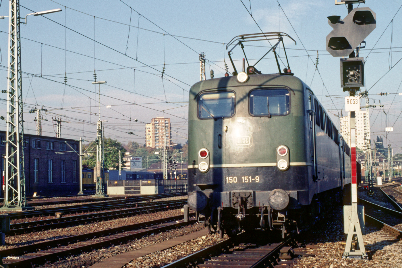 | 150 151 im Doppeltraktion mit einer weiteren 150er am 27.10.1988 kurz vor dem Hbf. Stuttgart. | |