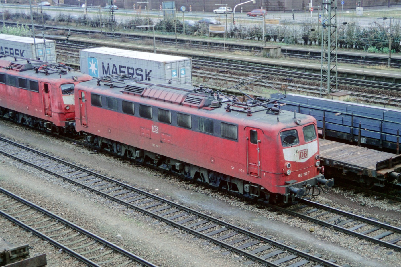 | 150 152 mit einer 140 im Schlepp nähert sich am 30.11.1997 von Westen dem Rbf. Mannheim. Im Hintergrund ist der Hp. Mannheim Rangierbahnhof zu erkennen, der längst dem weiter östlich gelegenen modernen S-Bahnhof Mannheim Arena/Maimarkt gewischen ist. | |