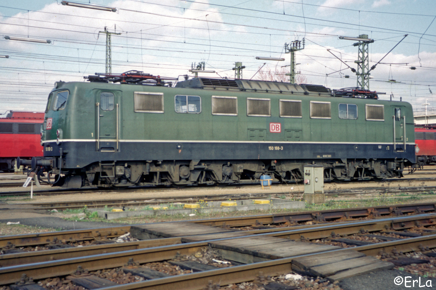 Inzwischen mit neuem DB-Logo, aber immer noch in grün, steht 150 168 am 09.04.1995 im Bw. Mannheim.