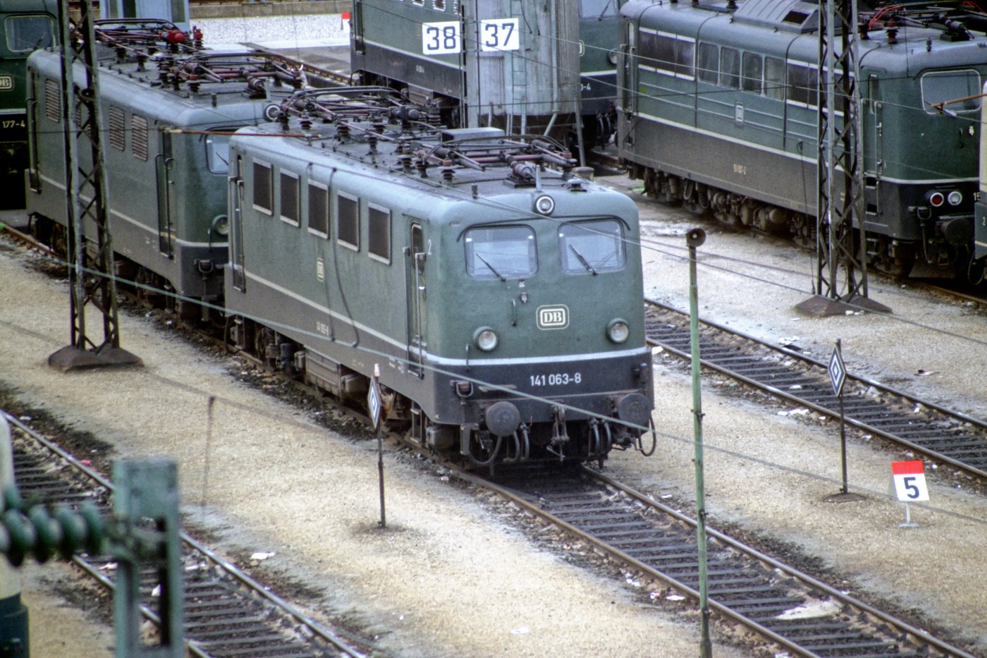 | Auf dem östlichen Abstellgelände ihres Heimat-Bw. Mannheim steht am 26.06.1988 die grüne 141 063. | |