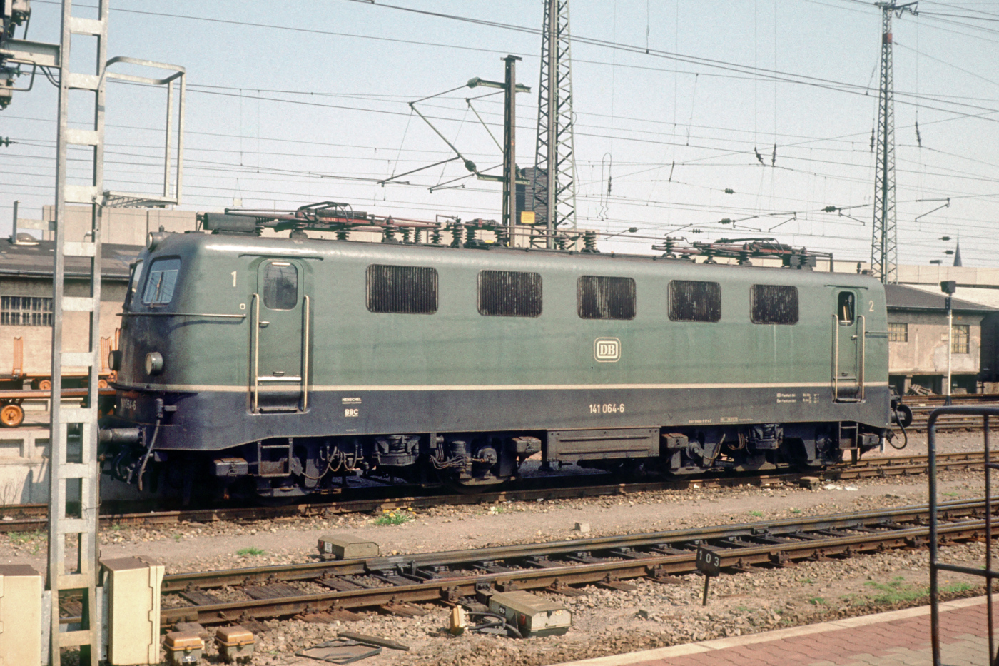 | Die in Frankfurt beheimatete 141 064 steht am 01.05.1982 an einem östlichen Bahnsteigende im Hbf. Mannheim. | |