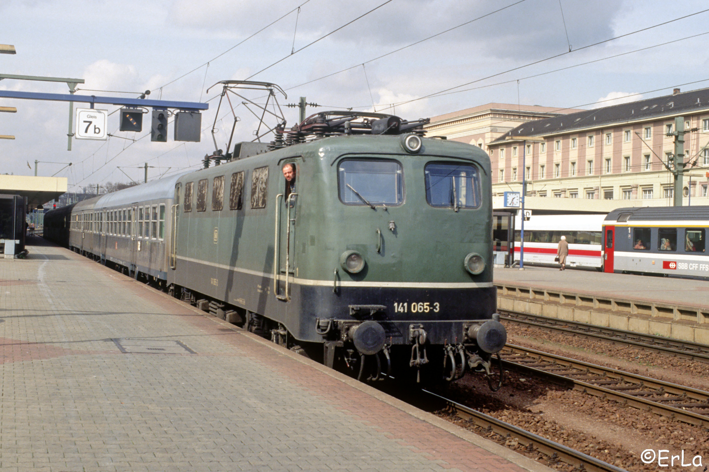 | Der freundliche Lokführer - heute müsste man wohl gendergerecht "Triefahrzeugführender" sagen - wird bei dieser Aufnahme der 141 065 im Hbf. Mannheim nachträglich wohl nicht dagegen haben, dass hier gegen DSGV "verstoßen" wird :-) | |