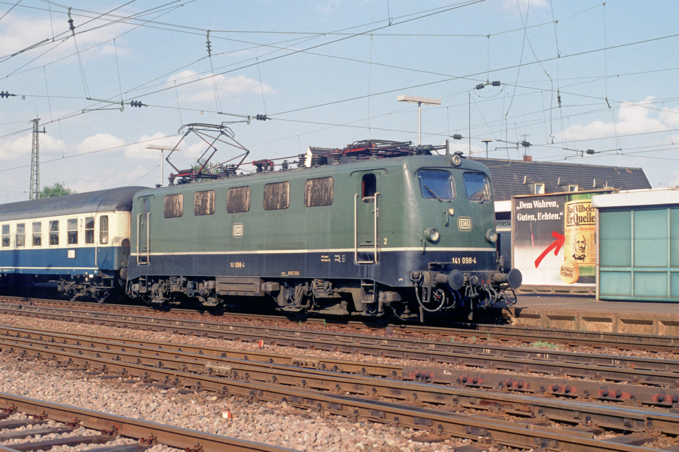 | "Auf halber Strecke" zwischen Mannheim/Lduwigshafen und Neustadt an der Weinstreaße hält 141 098 am 12.05.1990 im pfälzischen Bahnhof Schifferstadt. | |
